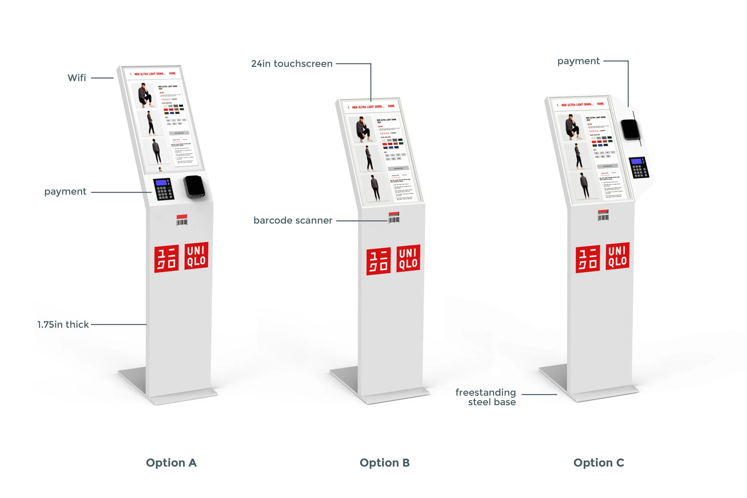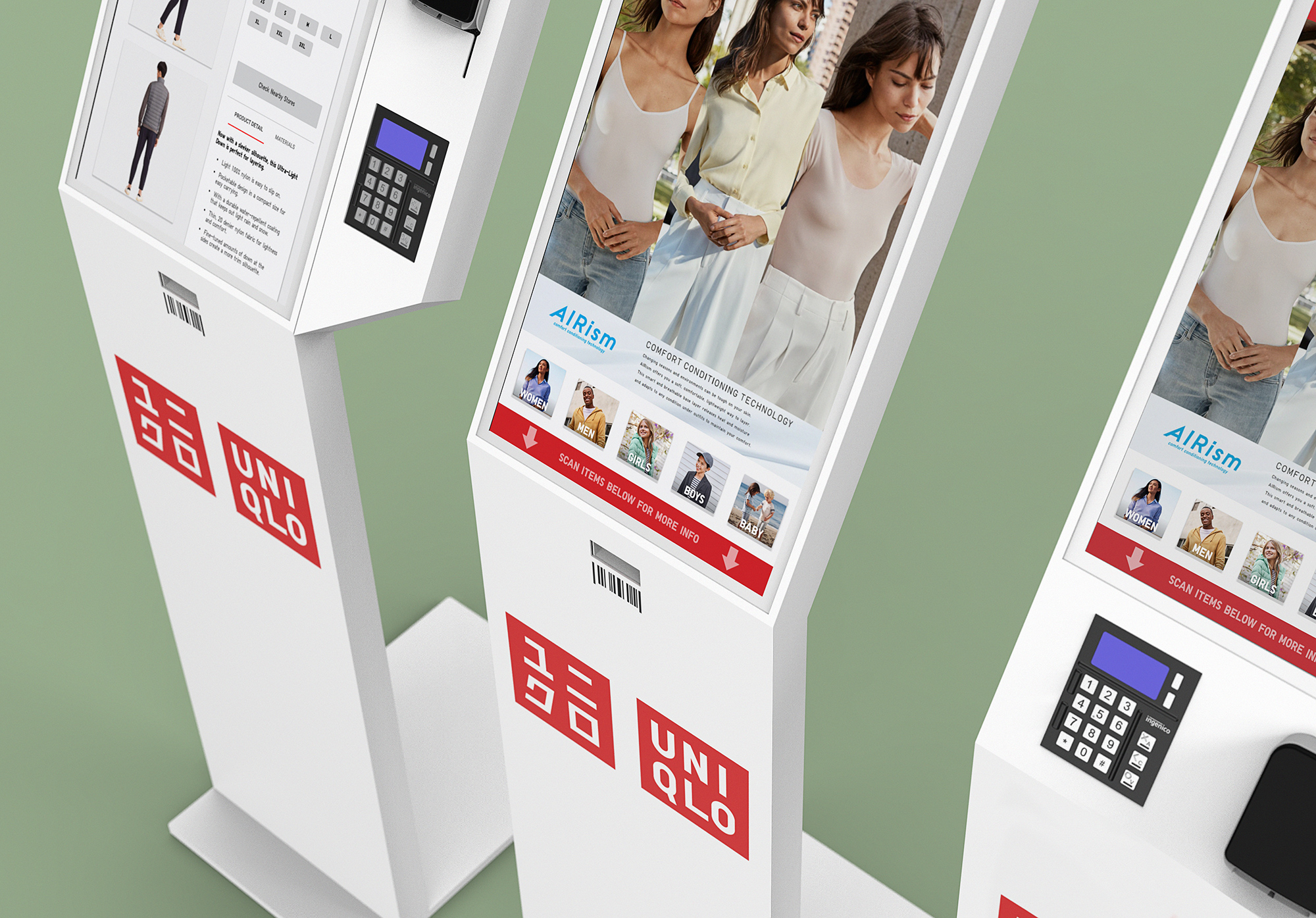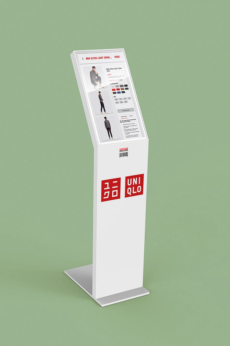 One of the lowest profile freestanding kiosks available at the time, the Point of Purchase Kiosk for Uniqlo was built to last with the most robust hardware. The modular internals allow for different configurations and quick repairs. Barcode scanners can be swapped for RFID readers and different payment and networking options can be added. Custom software allows for quick over-the-air updates and simple endless aisle content management.